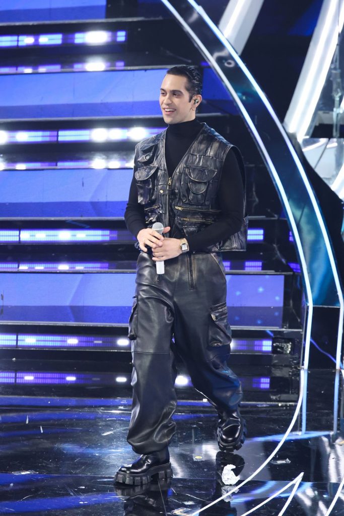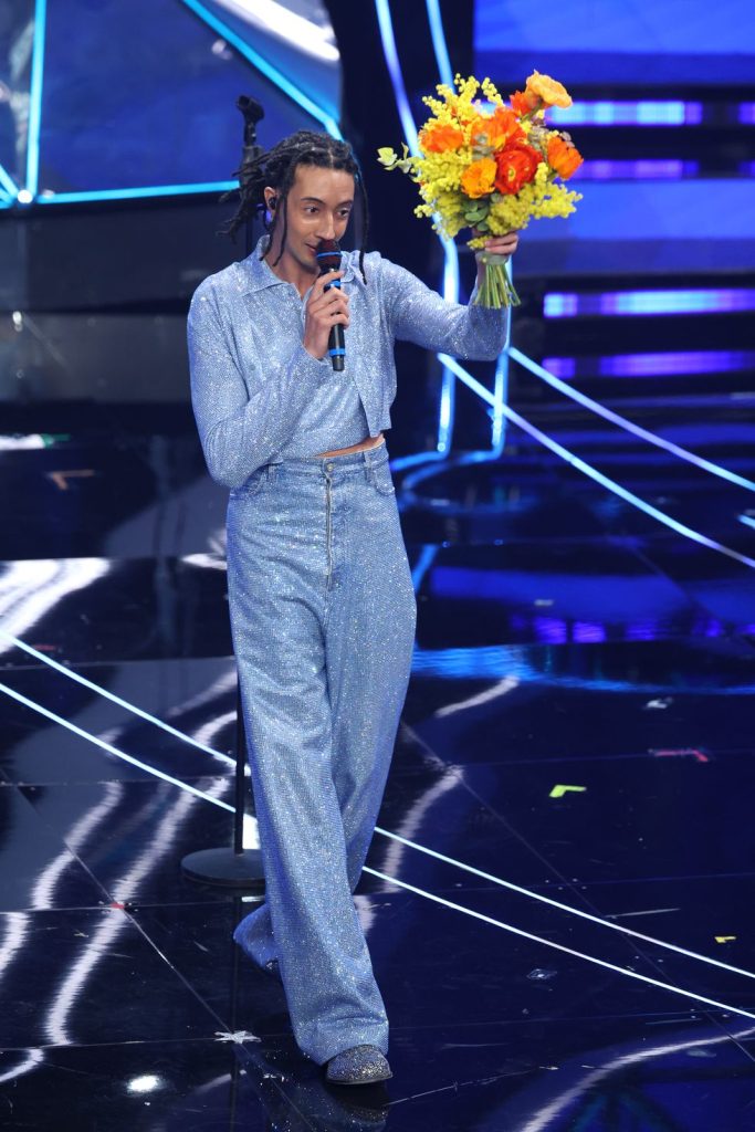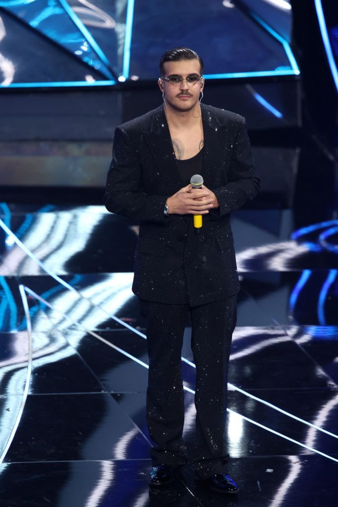 Наполитанскиот рапер носи наполитанската суштина на сцената со целосен изглед на Dsquared2. Избра црн смокинг со термолепливи кристали и блескави панталони, под палтото црна маица со прекрасно длабоко деколте. Очилата за сонце со ретро вкус ја даваат таа привлечност од 80-тите, малку Scarface, за облека која можеби ви се допаѓа или не, сепак е апсолутно кохерентна и во склад со карактерот.